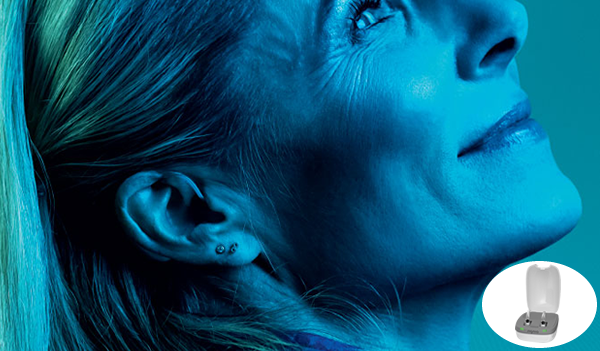 Discrição, conectividade e carregamento sem fios juntos em um só aparelho auditivo.